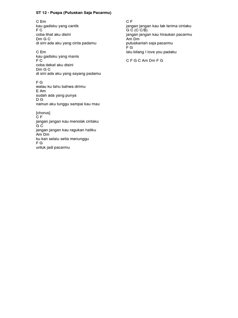 Kunci Gitar Dan Lirik Lagu St12 P U S P A Putuskanlah Saja Pacarmu Semua Halaman Bangka Sonora Id
