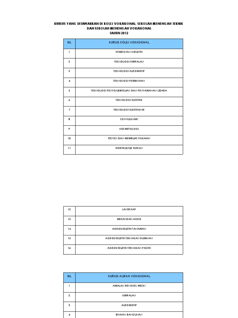 Kursus Yang Ditawarkan Di Kolej Vokasional Sekolah Menengah Teknik Dan Sekolah Menengah Vokasional Tahun 2012